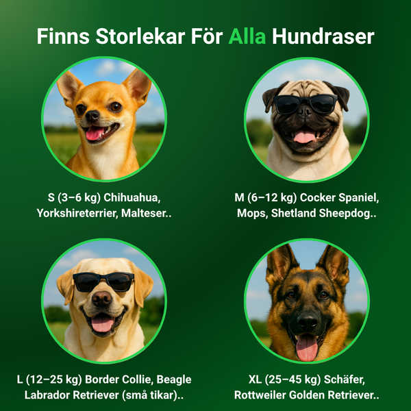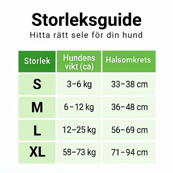 När du väljer storlek är din hunds komfort den viktigaste faktorn. Det som är viktigt att tänka på är att hundens skuldror borde kunna röra sig fritt och hundselen ska inte förhindra frambenens rörelser. Kika i tabellen nedan för att få reda på vilken storlek passar just din vovve. Hundselen har justerbara band så du enkelt kan anpassa den till din hunds kropp.